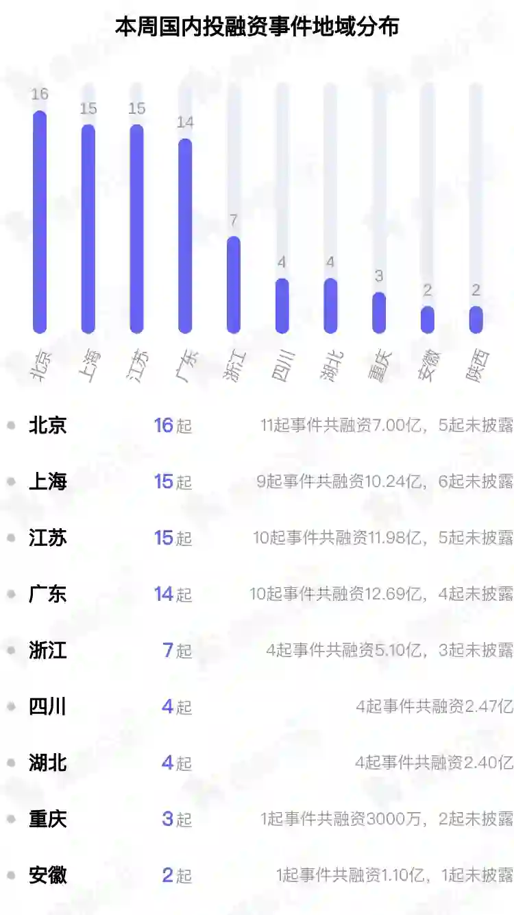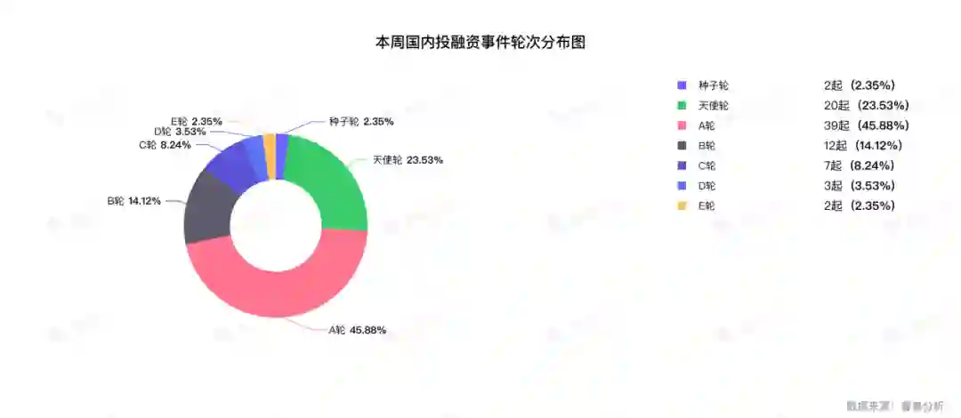 从本周披露获投企业的阶段分布来看,事件主要集中在A轮、天使轮和B轮,分别为A轮39个,天使轮20个,B轮12个。