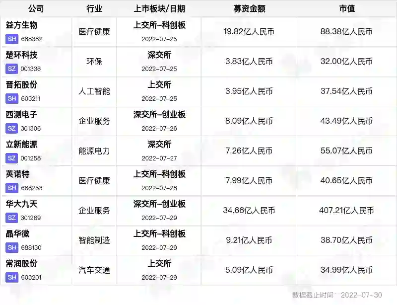 本周重点监测到国内9家公司IPO,分别于A股主板、科创板与创业板上市,最新市值最高为「华大九天」407.31亿人民币。
