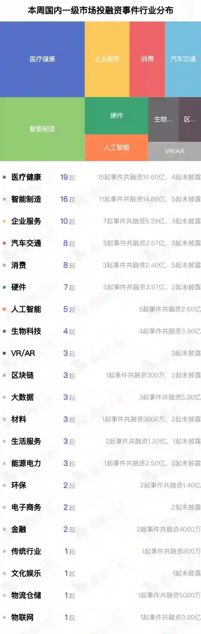 医疗健康(19个)、智能制造(16个)、企业服务(10个)领域融资最活跃。