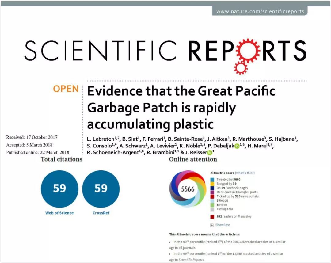 Laurent Lebreton与团队对北太平洋亚热带水域漂浮塑料进行了的为期三年的实地考察,包括一次多船航海勘探和一次空中侦察。他们的研究对臭名昭著的太平洋垃圾区中的海洋垃圾进行全面的量化分析和表征归纳,并发表在Scientific Reports 上,位列2018年Altmetric最受全球媒体关注的论文第7名。