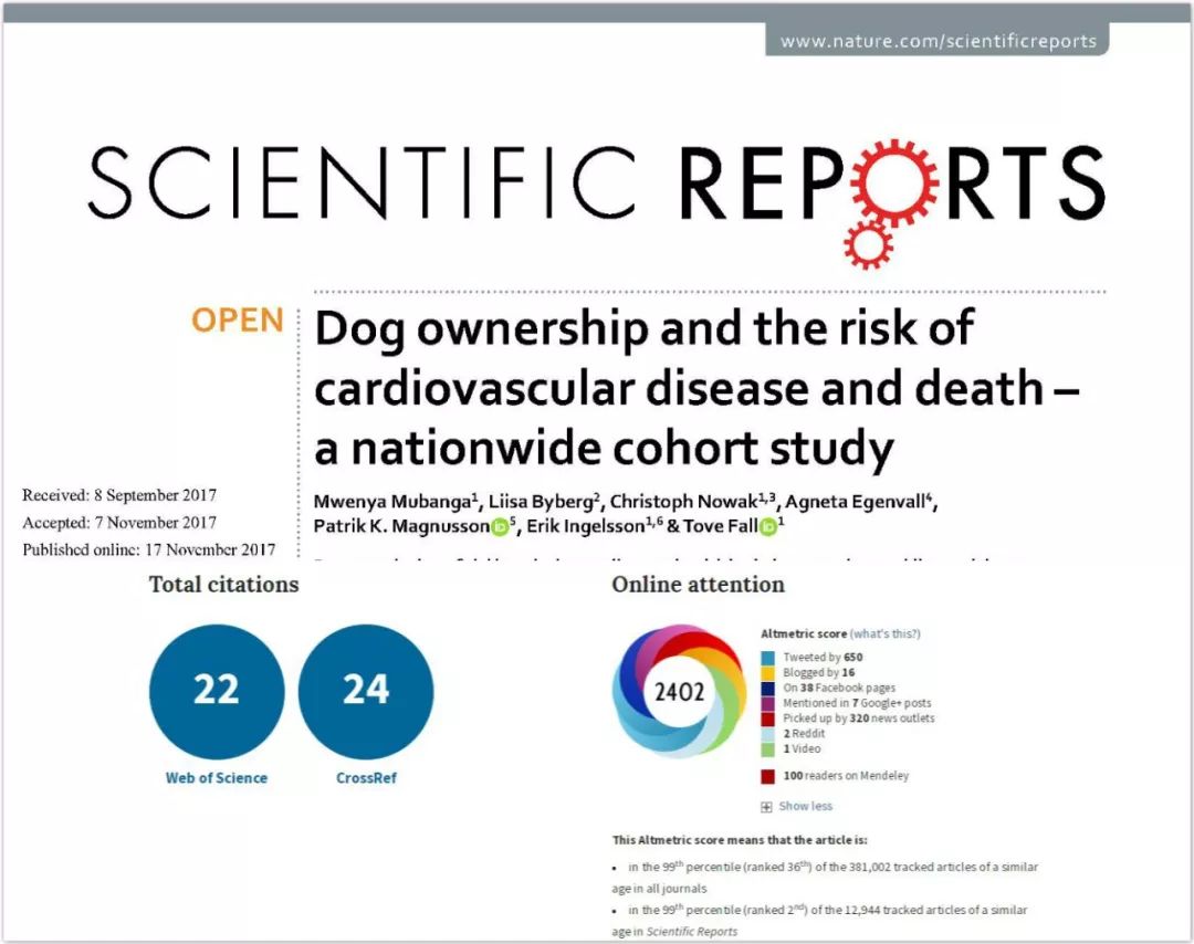 曾担任兽医的Tove Fall从自己的职业经验中深切感受到了宠物狗对主人的重要意义,改行从事流行病学研究后,她便与同事一起就“养狗对主人的潜在健康效应”为主题展开了研究。2018年,他们围绕养狗与心血管疾病风险的研究给爱狗人士又添了一个理由,并成为了Altmetric最受全球媒体关注的论文第70名。