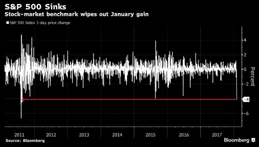 美国股市创6年半以来最大跌幅,道琼斯工业平均指数下跌超过1100点,在担心通货膨胀将导致利率升高的情况下,股市抛盘紧锣密鼓。标普500指数下跌4.1%,抹去2017年全部涨幅并转跌。