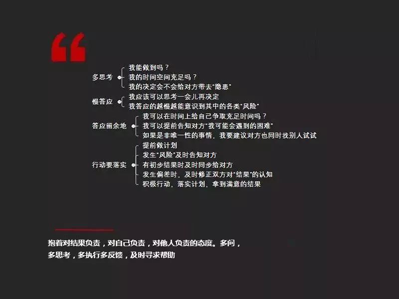 我总结了16字诀:“多思考,慢答应,答应留余地,行动要落实。”