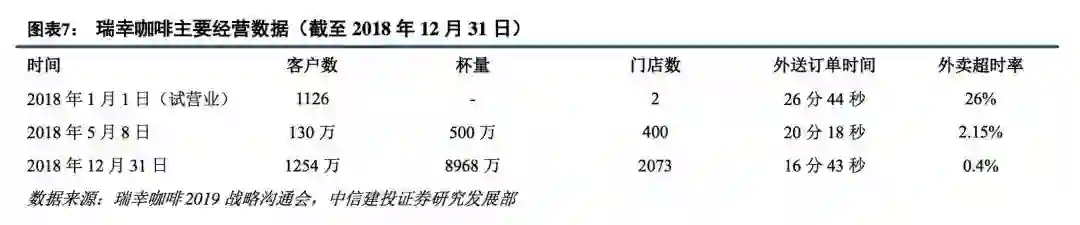 在配送方面,从18年初试营业至18年底,外送订单平均配送时间由26分44秒降为16分钟43秒,配送超时率由26%降为0.4%,保证了咖啡送达时的口味,目前总体客户满意度达99.6%,3个月复购率大于50%。