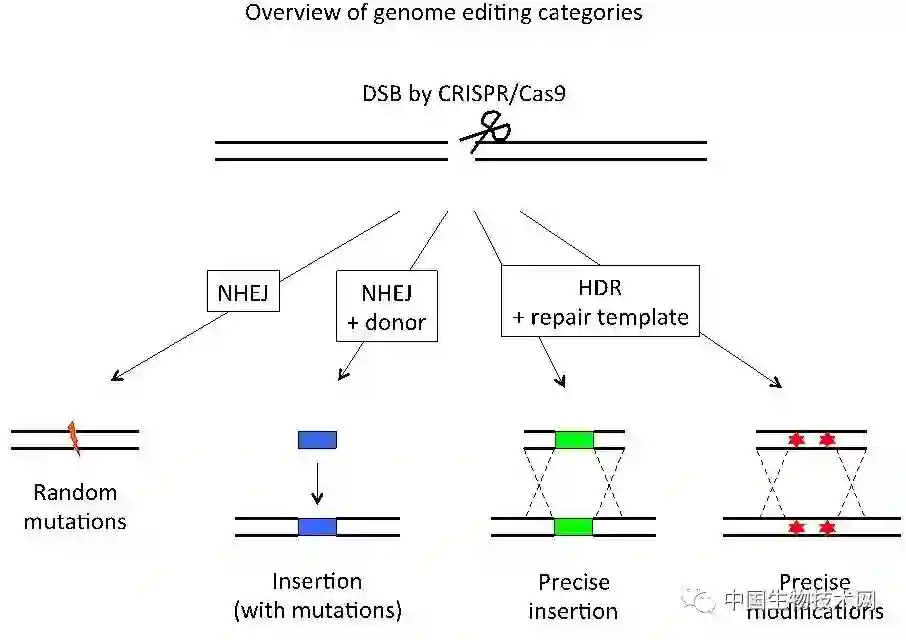 生物基因组的精准编辑是一项具有挑战性的工作,主要包括基因的敲除、敲入、替换等。近年来,CRISPR/Cas9系统在多种生物中实现了高效的基因敲除编辑。它先在基因组产生位点特异性地双链断裂(DSB),这些双链断裂再依赖细胞的两种内源机制来修复,一种是易错易突变的非同源末端连接(NHEJ),另一种是需要同源DNA模板介导的无错无差异的同源重组修复(HDR)。由于同源重组这种修复机制的发生概率较低,因此目前基因编辑领域比较高效的是造成基因突变的敲除编辑。