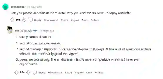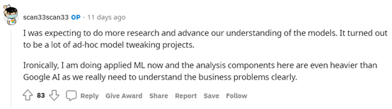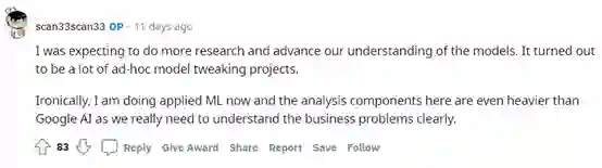 尽管帖主本人加入 Google AI 后获得了许多技术水平方面的提升,但是当他发现自己的工作逐渐偏离了针对模型的研究性工作,而是转向针对各个临时项目的微调后,他告诉自己,是时候准备离开了。