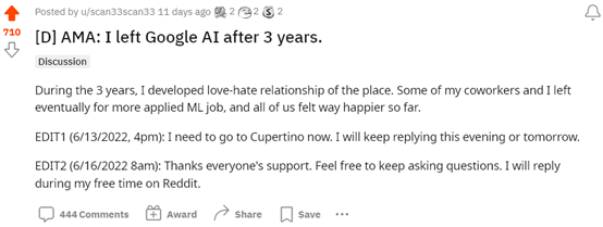 而现在竟然有人主动提出离开谷歌?近日在国外 Reddit 论坛上,一则以 AMA(Ask Me Anything)开头的帖子在以学术讨论为主的 MachineLearning 频道引发了热议。