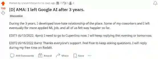 https://www.reddit.com/r/MachineLearning/comments/vbh2vx/d_ama_i_left_google_ai_after_3_years/