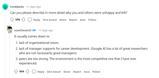 帖主认为,一个来自顶层的方向指引对于项目是否成功非常重要,而谷歌的许多研究目标都显得非常地“模糊”。因此,对于工业界中的公司选择,帖主更偏好去一些年轻的且拥有更多应用场景的团队进行工作,例如 Meta AI ,例如 Apple 。