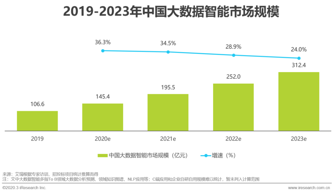 据艾瑞咨询统计推算,2019年涵盖大数据分析预测、领域知识图谱及NLP应用的大数据智能市场规模约为106.6亿元,预计2023年将突破300亿元,年复合增长率为30.8%,其中2019年市场中以金融领域和公安领域应用份额占比最大,金融领域因标准化数据积累丰富,行业认知与直接需求最为明显等因素,成为数据智能最早落地并产生价值的行业;公安领域经过三年的感知智能基础设施建设,已经初步形成人工智能应用环境,在党中央和公安部的号召指导下,公安大数据建设将成为下一阶段的主题,这一趋势也在2019年相关招标项目中得以体现。随着整体市场数据基础的完善和需求唤醒,大数据智能领域规模持续走高,但在行业可落地性和理性建设的限制下,预计市场增速将呈现下降趋势,期间咨询性需求将会大量出现,从整体发展来看增速处于良性区间,对真正有价值的公司和产品有正向意义。