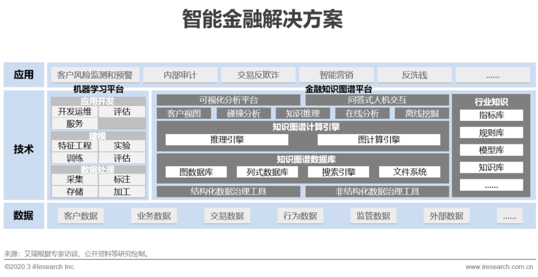 在金融领域中无论是传统金融或是互联网金融,信用评估、反欺诈和风险控制都是最为关键的环节,随着近些年金融数据的爆发式增长,传统风控系统逐渐力有不逮,而应用机器学习算法和知识图谱的智能风控系统在风险识别能力和大规模运算方面具有突出优势,逐渐成为金融领域风控反欺诈的主要手段。机器学习和知识图谱相结合是目前主流的解决方案,其中机器学习算法通过概率计算的方式,以数学运算特征反应风险情况,形成易于机器计算的风控模型;而知识图谱通过权威经验和规则创建本体模型和抽取实体的范围,根据实体间关系形成关联数据网的图谱形式,描画囊括个人基础信息、金融行为、社交网络行为等用户综合画像,根据画像情况和模型对应,形成具有金融业务特性的风控体系,在解决方案的决策环节结合规则和概率的综合评价,给出最终的风险评估,整个过程能够实现秒级响应。知识图谱的应用不仅能够为缺乏可解释性的机器学习算法带来必要的参考系,还可以串联金融业务中产生的大量多源异构数据形成数据中台,挖掘数据深层价值,为实现精准营销、投资关系梳理、产业链风险预警、智能催收等上层应用打下基础。