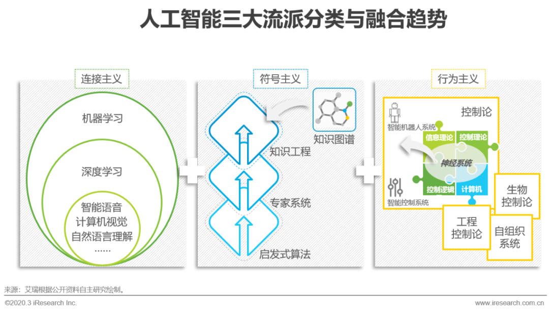 人工智能是对一类能够实现机器模拟智慧生命某些特征的技术统称,从学术上可以分为,对人类已有知识进行组织编辑的符号主义、通过数学理论公式推导聚类和预测问题的连接主义,以及利用机器模仿生物活体行为的行为主义三个流派,分别以知识工程、机器学习和仿生机器人为时代代表,而知识图谱就是新一代知识工程的具体体现。2012年,深度学习在计算机视觉和智能语音上产生重大突破,打开了人工智能商业化的大门,使得连接主义一度成为人工智能的代名词,但随着应用落地成为主旋律,缺位行业逻辑和理论概念的连接主义,往往找不到最佳的应用场景而止步于浅层尝试,在此背景下,人工智能技术应当走向融合,符号主义需要连接主义提供强大的计算支撑,连接主义需要符号主义的逻辑指导,二者又共同作用于行为主义,充当机器人的大脑和“记忆宫殿”,在多种技术综合利用下的垂直领域智能解决方案才是当今最符合市场期待的方向。