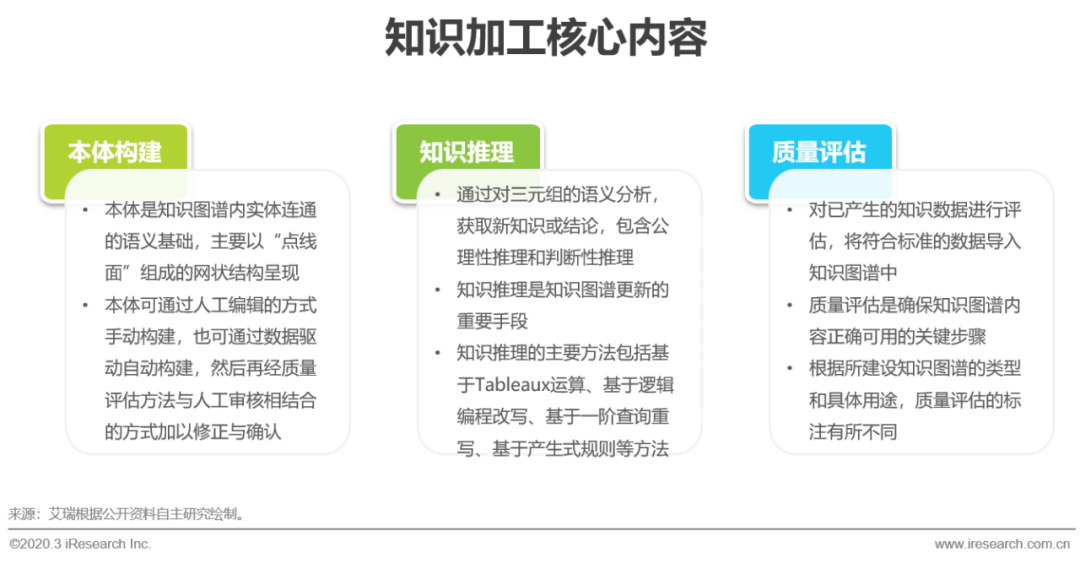知识图谱从逻辑上可以分为概念层和数据层,数据层指以三元组为表现形式的客观事实集合,而概念层是它的“上层建筑”,是经过积累沉淀的知识集合。建设中以本体模型和实体数据库为核心,根据二者的建设顺序又分为先定义本体和数据规范,再抽取数据的“自顶向下型”和先抽取实体数据,再逐层构建本体的“自底向上型”两种模式,前者适用于场景较为固定,存在可量化行业逻辑的领域,如金融、医疗、法律等;后者适用于新拓展的,有大量数据积累,行业逻辑难以直接展现的领域。总体而言,搭建知识图谱从数据源开始,经历了知识抽取、知识融合、知识加工等步骤。原始的数据通过知识抽取或数据整合的方式转换为三元组形式,然后三元组数据再经过实体对齐,加入数据模型,形成标准的知识表示,过程中如产生新的关系组合,通过知识推理形成新的知识形态,与原有知识共同经过质量评估,完成知识融合,最终形成完整形态上的知识图谱。