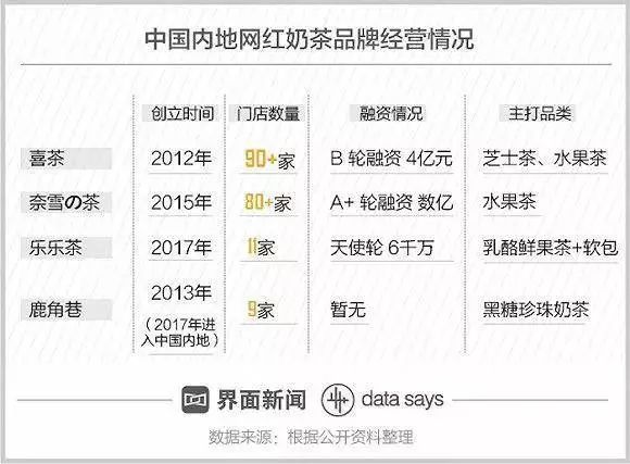 新式奶茶也更容易吸引资本的青睐。在今年4月,喜茶宣布完成了美团点评旗下龙珠资本投资的4亿元B轮融资,用于全面提升供应链、管理信息化等;3月,奈雪の茶宣布获得由天图资本领投的数亿元A+轮融资,估值达到60亿元,表示未来将加速开店与落实整体品牌体验。