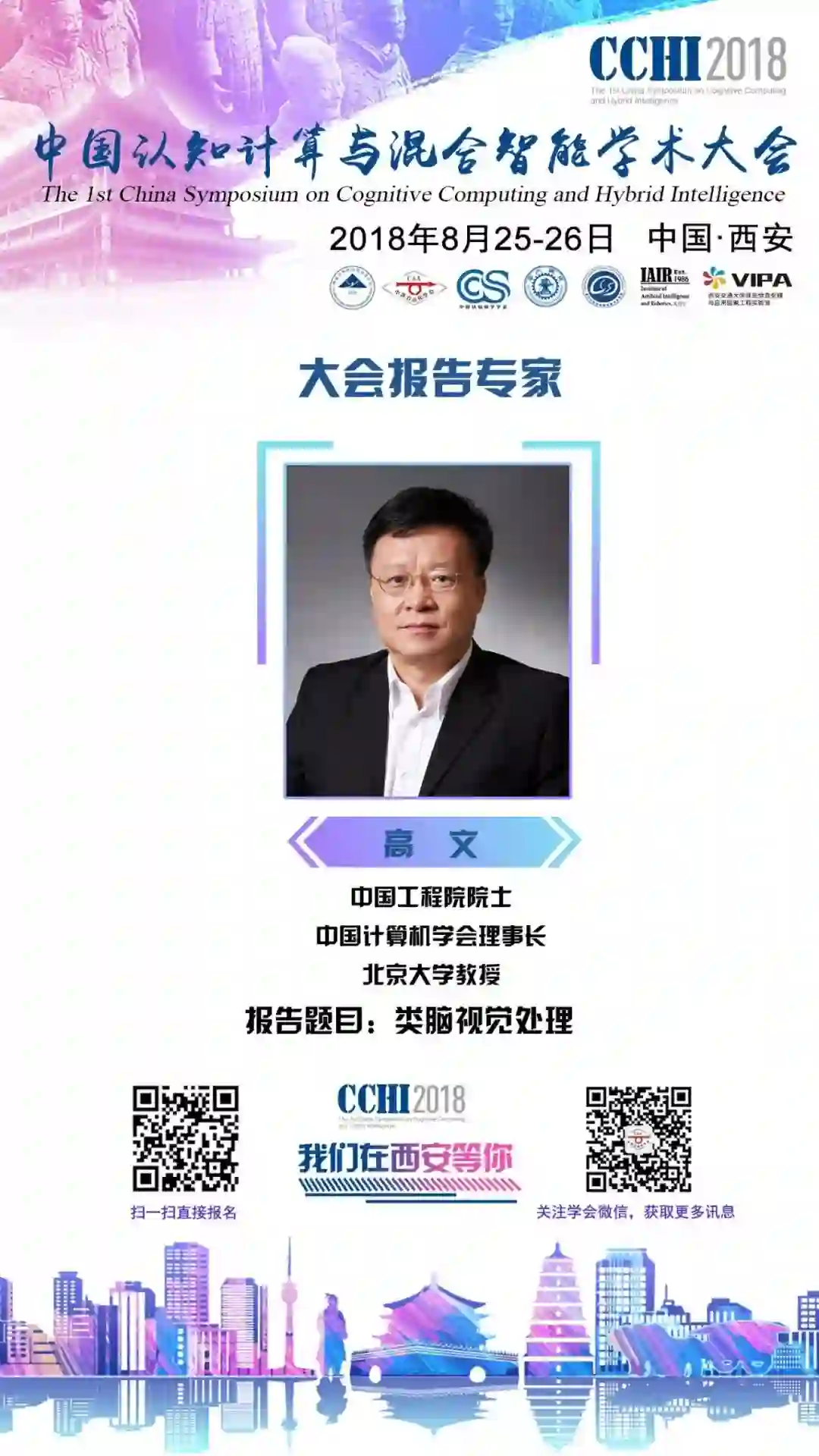 专家简介:高文,男,1956年出生,中国工程院院士,北京大学博雅讲席教授、博导、信息与工程科学部主任,中国计算机学会理事长,新一代人工智能产业技术创新战略联盟理事长,全国专业标准化技术委员会副主任,数字音视频编解码技术标准(AVS)工作组组长。1988年获哈尔滨工业大学计算机应用博士学位,1991年获日本东京大学电子学博士学位。他曾在美国卡内基梅隆大学(CMU)机器人研究所﹑美国麻省理工学院(MIT)人工智能实验室等做过访问科学家。他1992年入选进入国家863智能计算机主题专家组,担任智能计算机接口领域的责任专家,1996年至2000年任专家组组长。他1998年至1999年曾担任中科院计算所所长,2000年至2004年担任中科院研究生院常务副院长,其间2000年至2003年兼任中国科技大学副校长。他2013年3月至2018年2月担任国家自然科学基金委员会副主任。2018年3月31日新任鹏城实验室(深圳网络空间科学与技术广东省实验室)主任。高文教授曾担任第十届、十一届、十二届全国政协委员,国务院学科评议组计算机学科成员,计算机学报主编。先后兼任IEEE T-CSVT、IEEE T-AMD、SPIC、JVCIR、IEEE FIP等期刊的编委。他曾担任IEEE ICME 2007(IEEE多媒体领域旗舰会议)、ACM MM 2009(ACM多媒体领域旗舰会议)、 IEEE ISCAS 2013(IEEE电路与系统协会旗舰会议)大会主席等。