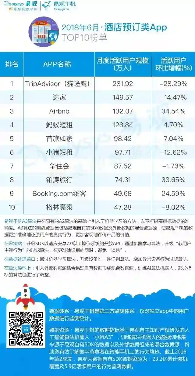 在6月份酒店预订APP TOP10榜单中,TripAdvisor猫途鹰以231.92万活跃用户规模继续稳居榜首,途家149.57万活跃用户规模位居第二位,Airbnb爱彼迎以132.07万活跃用户规模位居第三位。另外,首旅如家以98.42万位列酒店集团首位。