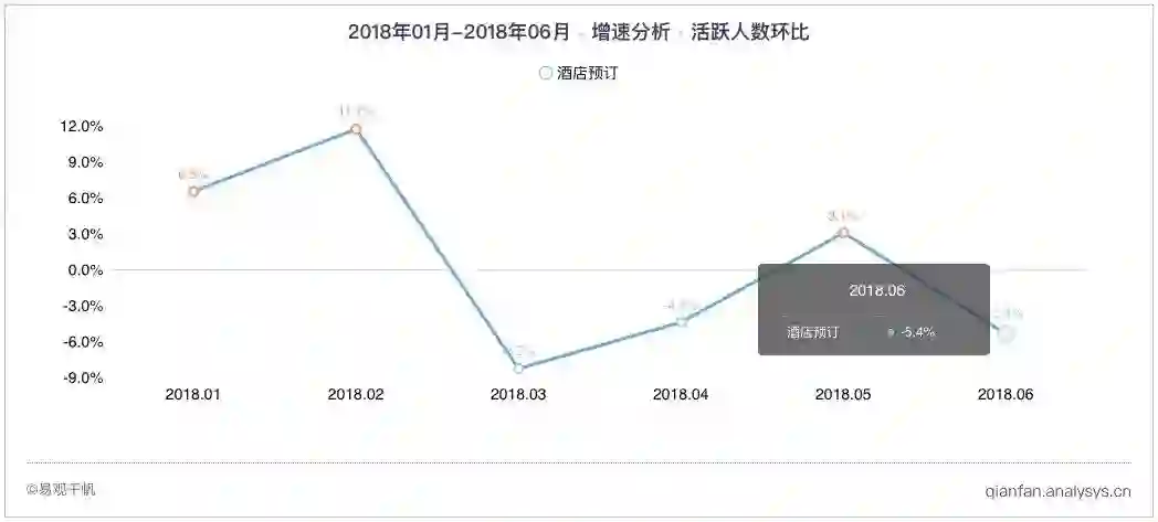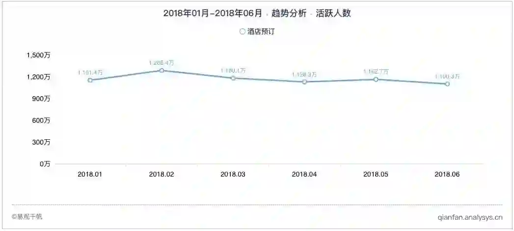2018年6月份,酒店预订应用月活跃用户规模为1100.3万,环比下降5.4%。