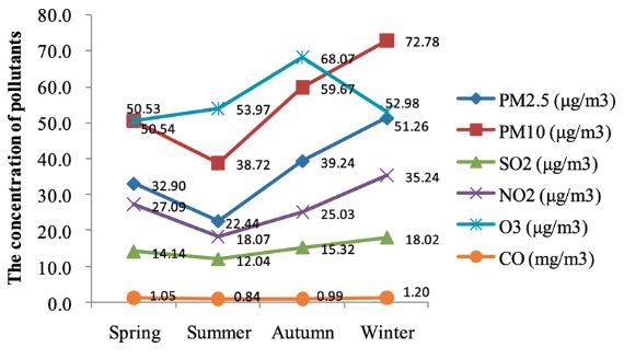 Ying Liu等人发现,广东省PM2.5、PM10、SO2、NO2、CO、O3污染水平均低于全国大气污染浓度,并且PM2.5、PM10、SO2、NO2、CO浓度呈明显的季节变化趋势,冬季最高,夏季最低。O3浓度在9月(65.72μg/m3)和10月(84.18μg/m3)相对较高。
