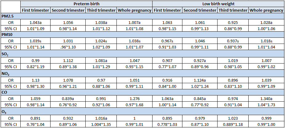 表1.妊娠暴露于空气污染与早产/低出生体重的关系