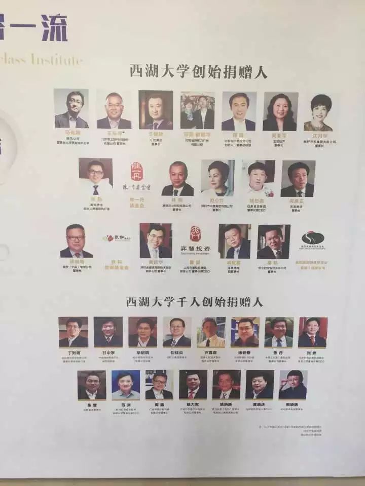 行政楼大厅里,有一面宣传板很引人瞩目,上面排出了西湖大学创始捐赠人的头像,从马化腾、王健林开始,满满一墙的捐赠人,彰显这所新型高等院校雄厚的资金后盾。