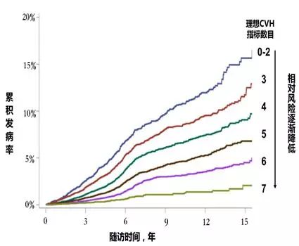 横轴:随访时间(年),纵轴:累积发病率。CVH,cardiovascular health,心血管健康。该图表示:随访时间相同时,理想CVH指标数目越多的群体,动脉粥样硬化性心血管病的累积发病率越低;说明随着理想CVH指标数目的增加,发生动脉粥样硬化性心血管病的相对风险逐渐降低。