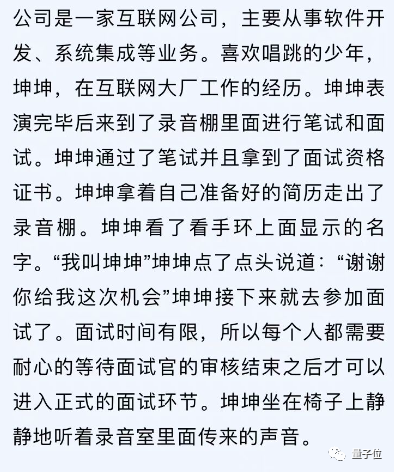 点击生成,于是,得到了一段坤坤参加大厂面试招聘的故事。