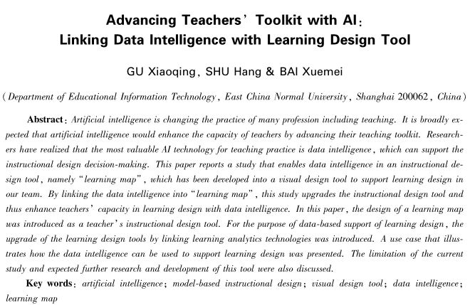人工智能作为当今最先进的智能技术之一,正在以其前所未有的方式改变着诸多行业。人工智能技术虽然在可预见的将来不会取代教师这一职位,但智能技术能为教师增能已逐渐被人接受。近年来,研究者认识到,对于教学实践来说,最有价值的智能技术是数据智能,即学习分析技术所关注的数据支持的教学决策。延续本团队在教学设计工具以及学习分析技术方面的研究,本文对“学习地图”这一教学设计工具加以数据智能的拓展。文章首先从基于模型的教学设计工具的角度,对学习地图这一教师工具进行分析;然后从利用学习分析工具提供数据支持的学习改进角度,提出挖掘数据智能以便为教学设计增能的可能性及其设计,以期为智能时代的教师工具提供开发思路。