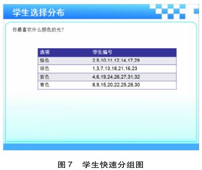 互动问答生成合作探究主题。在课程进行过程中,教师为了更好地开展合作探究活动,需要根据学生的认知水平对其进行分组。教师可根据学生的兴趣点作为分组的依据,从而更好地促进他们参与到合作中。本案例中,学生对“创造你的彩光”的互动回答,让教师及时掌握学生的兴趣所在,并根据他们的选择快速对其进行分组(见图7)。