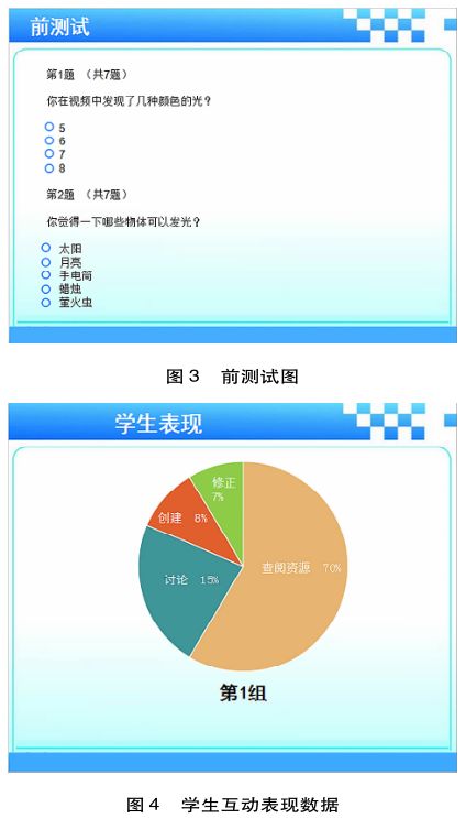 首先,为了获取学生进入正式学习前对这一知识的学习是否存在“前概念”以及前概念的成因和类型,在热身导入环节新增前测试环节,以量表与问卷的方式获取数据(见图3)。其次,课标要求这一节课时学习目标是培养学生的合作探究能力。因此,为了满足学生分组合作需求,在内容介绍环节后,新增“互动问答环节”,以了解学生对问题的认识水平,从而作为学生分组的依据,并且在合作探究环节,利用平台系统记录学生之间的互动水平与程度(见图4)。最后,为了让教师获得对教学成效的直观认识,向教师呈现教学评测的结果,以方便教师及时修正教学设计方案。为此,汇报总结环节以及教学评测环节都为获取相应的评测数据埋下节点。