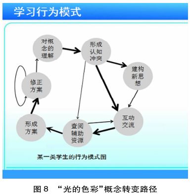 沿用以上学习地图方案,教师可迅速开展合作探究教学,然而,对“光源、光的色散、色光的混合”等重要科学知识,学生的“前概念”是否会影响学习者的学习过程,且学生进行科学概念理解时究竟延承了怎样的路径模式,这些维度的信息对教师的教学具有重要意义,教师可以根据学习分析所提供的结果进行教学的过程性改进。该案例中,学习分析所依据的数据来源在教学设计时已有设计。