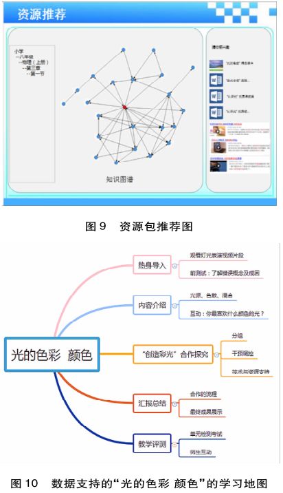 概念转变路径带来个性化资源推荐。学习地图后台中的学习分析工具利用最终的教学评测数据以及过程性数据分析,对学生的概念转变路径进行绘制,帮助学生确定学习的规律和模式。本案例中,运用后台系统的行为模式分析模型,绘制学生概念学习的过程性数据,最终获得“光的色彩颜色”这一知识的概念转变路径(见图8)。同时通过可视化的技术方式为教师和学生呈现,并根据协同过滤、决策树等算法为师生推荐个性化的学习资源包(见图9)。本案例中学生的概念转变行为模式中“互动交流”与“形成认知冲突”尤为关键,因此教师可以在教学设计时根据这一模式特征,为学生创设更加真实的学习情境,激发认知冲突,同时参与到学生的交流互动之中,引导并鼓励他们的参与行为,为教师提供更具针对性的个性化资源。
