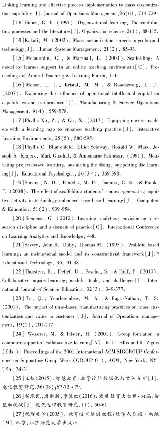 定制代表了一种新的生产范式,其目标是产品的个性化增值效益与标准化生产的成本效益相结合。随着定制概念的普及,越来越多的定制方案被提出,主要体现在产品的设计与流程的变化(Feltzinger et al.,1997;Tu et al.,2001)。遵循定制模式进行设计,意味着面临教学环境的更多不确定因素。这也使越来越多的研究强调关注知识和学习在适应不断变化的环境中的作用(Menor et al.,2007)。然而,学习是复杂而艰巨的。特别是涉及隐性知识时,潜在的模糊的因果关系可能会妨碍学习的有效性(Huang et al.,2008)。只有学习的有效性在学习过程中反映出来,才能体现出定制机制的强大能力(Huang et al.,2008)。如果学习的设计过程不伴随行动而变化,学习的绩效也得不到提升(Huber,1991)。由学习创造的知识必须转化为过程的能力,实现其在过程改进中的潜力(Garvin,1993)。因此,人们需要从过程实施的角度出发,寻求能够提升定制效率的有力抓手。为满足学习定制的需求,学习地图2.0版将焦点放在过程性数据的收集与分析上,为教师的生成教学设计方案提供数据及分析支持,使教学设计的过程性表征成为定制成效发生的现场。
