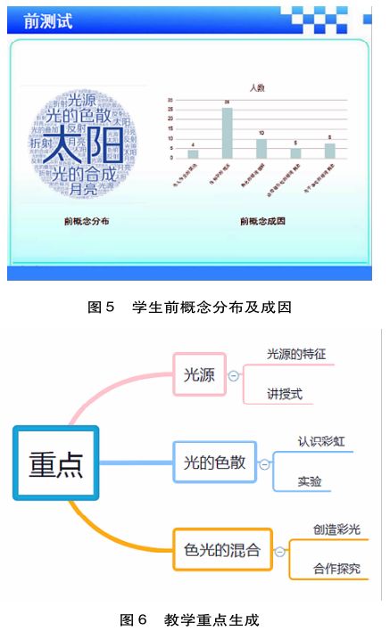 根据前概念的把握确定教学设计的重点。对学习前概念的把握,可以帮助教师更好地分析学生的认知基础,从而帮助教师更好地确定教学重点以及需要运用的教学方式方法。本案例中,通过“导入阶段”的前测试统计学生对“光的色彩”知识,教师可以看到他们的前概念分布以及前概念的成因(见图5),由此确定了“光源”“光的色散”“光的合成”三个方面为教学重点。进而在内容介绍时,教师着重为学生讲解这三个方面的知识,通过动画、视频片段等信息呈现方式,强化学生的认知。
