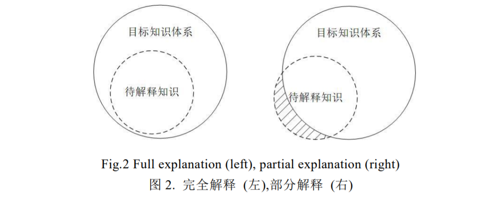 具体来说,完全解释和部分解释描述的是知识体系之间的包含情况(图 2)。只有当待解释的知识体系完全 被目标知识体系所包含时,才可能进行完全解释,否则只能进行部分解释。在 XRL 中,完全解释通常是不必要的。