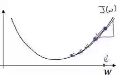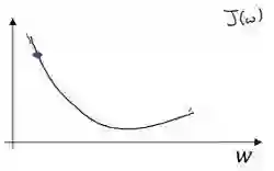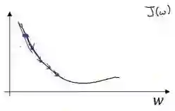 假设我们以如图点为初始化点,该点处的斜率的符号是负的,即dJ(w)/dw<0,所以接下来会向右走一步。