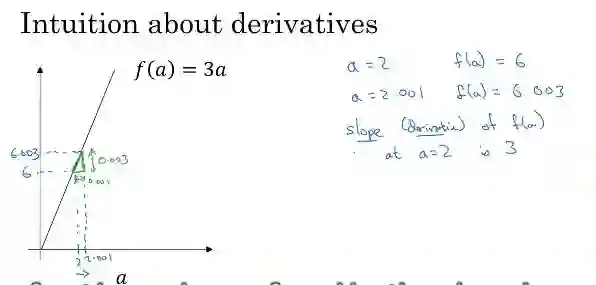 我在这里画了一个函数 f(a)=3a,它是一条直线。下面我们来简单理解下导数。让我们看看函数中几个点,假定 a=2,那么 f(a) 是 a 的 3 倍等于 6,也就是说如果 a=2,那么函数 f(a)=6 。假定稍微改变一点点 a 的值,只增加一点,变为 2.001,这时 a 将向右做微小的移动。0.001 的差别实在是太小了,不能在图中显示出来,我们把它右移一点,现在 f(a) 等于 a 的 3 倍是 6.003,画在图里,比例不太符合。请看绿色高亮部分的这个小三角形,如果向右移动 0.001,那么 f(a) 增加 0.003, f 的值增加 3 倍于右移的 a ,因此我们说函数 f(a) 在 a=2,是这个导数的斜率,或者说,当 a=2 时,斜率是 3。导数这个概念意味着斜率,导数听起来是一个很可怕、很令人惊恐的词,但是斜率以一种很友好的方式来描述导数这个概念。所以提到导数,我们把它当作函数的斜率就好了。更正式的斜率定义为在这个绿色的小三角形中,高除以宽。即斜率等于 0.003 除以 0.001,等于 3。或者说导数等于3,这表示当你将 a 右移 0.001,f(a) 的值增加 3 倍水平方向的量。