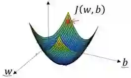 如图,这就与刚才的图有些相反,因为它是非凸的并且有很多不同的局部最小值。由于逻辑回归的代价函数(成本函数)J(w,b)特性,我们必须定义代价函数(成本函数)J(w,b)为凸函数。
