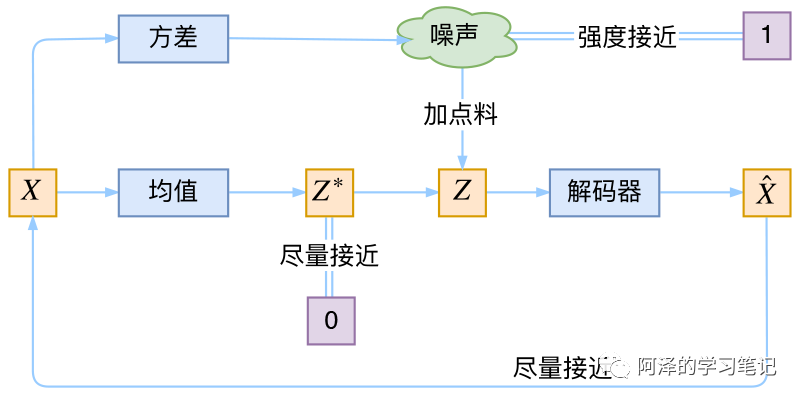 VAE 通过构建两个神经网络来分别学习均值和方差 ,这样我们便能得到样本 的专属均值和方差了,然后从专属分布中采样出 ,然后通过生成器得到 ,并通过最小化重构误差来进行约束 。