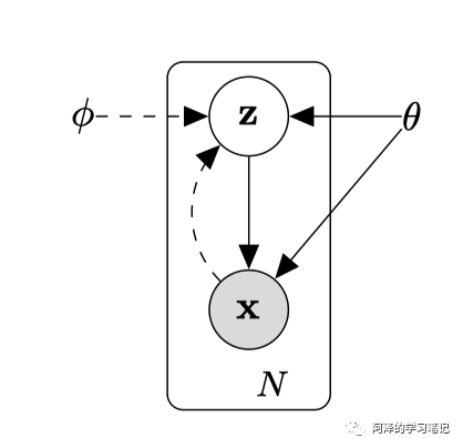 而 VAE 则是利用神经网络学习来学习变分推导的参数,从而得到后验推理的似然估计。下图实线代表贝叶斯推断统计的生成模型 ,虚线代表变分近似 。