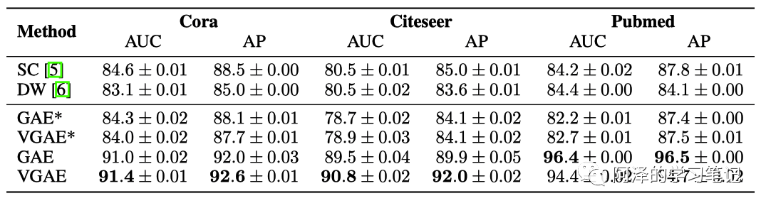 简单看一下实验部分,主要是边预测问题,我们也可以看到 VGAE 是预测邻接矩阵的。