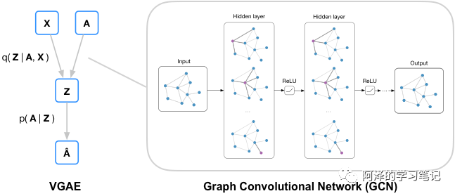 其中,X 为节点的特征矩阵,A 为邻接矩阵,先利用后验概率得到隐变量 Z,再用隐变量重构邻接矩阵 A。
