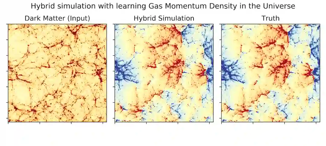 图 3:混合模拟示例,其中我们用 2 层非线性变换(网络)来补充 PM 模拟的暗物质输出(左),以模拟宇宙中的气体动量密度(中心)。将其与使用成本高达 1000 倍的水力模拟(右)所模拟的真实结果进行对比