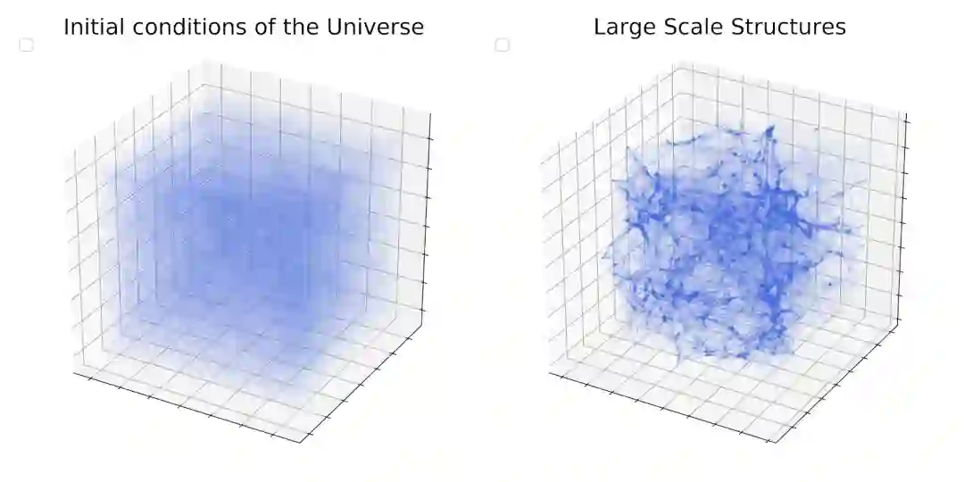 所示为从最终暗物质宇宙场(右)中的大尺度结构重建宇宙初始条件(左)的动态