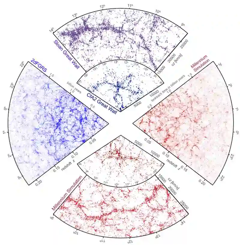 图 1:(蓝色)2dFGRS 测绘计划中观察到的宇宙结构。(红色)千年 N 体模拟中生成的对应结构
