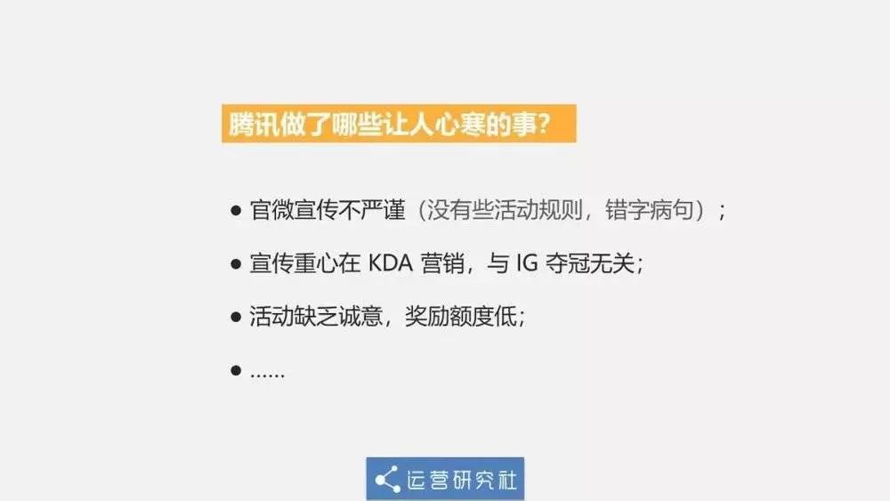 总之,让 KDA 皮肤营销时紧扣 IG 夺冠的主题,调动起用户对夺冠这件事的荣誉感,成全老玩家对游戏的情怀。如同王思聪的那条抽奖微博,将大众的视线转回夺冠,既成功关注事件本身,更成全大家的情绪发泄,自然能实现引爆的效果。