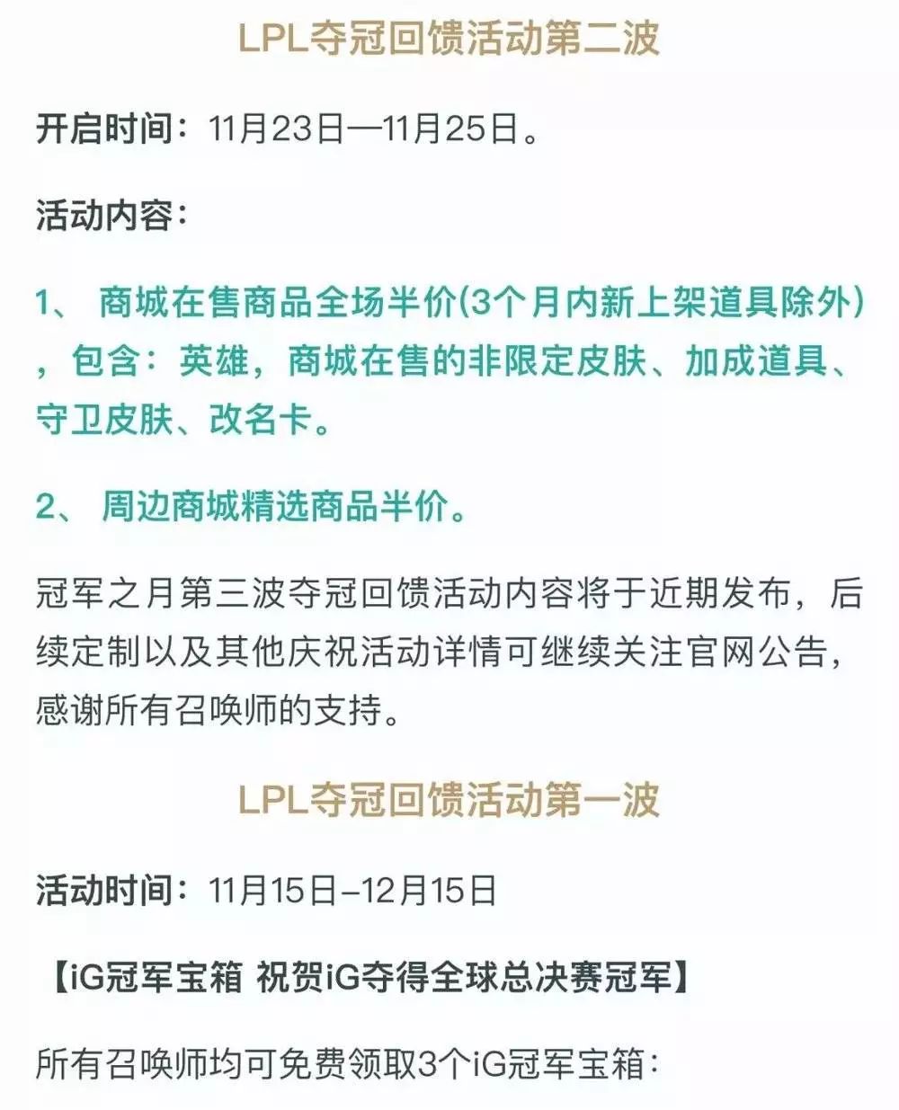 而如今,IG 11 月 3 日夺冠,官方直到 11 月 5 日才放出活动预告(后迫于压力改为第一波活动),但仅仅是永久皮肤一个,随机图标一个(excuse me??冠军限定的图标都不能给一个吗?),再加上战队此次总决赛使用的英雄及皮肤的30天使用权,没了。