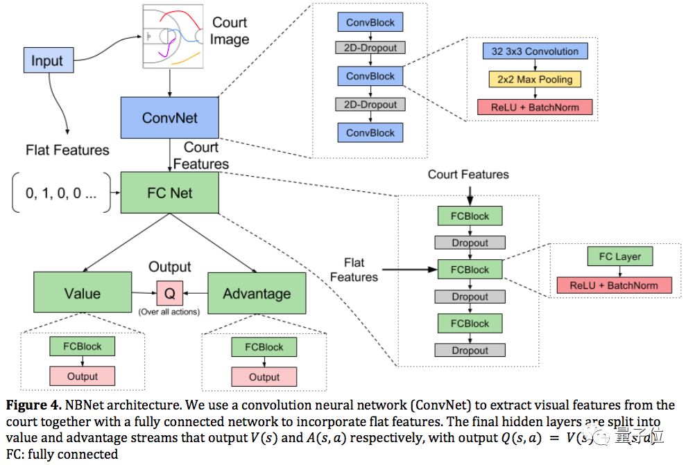 可视化的球员运动轨迹交给卷积网络(ConvNet)去提取视觉上的特征,至于非空间特征值则交给全连接网络(FC Net)处理,最后输出Q值,相当于是给包夹效果打个分。