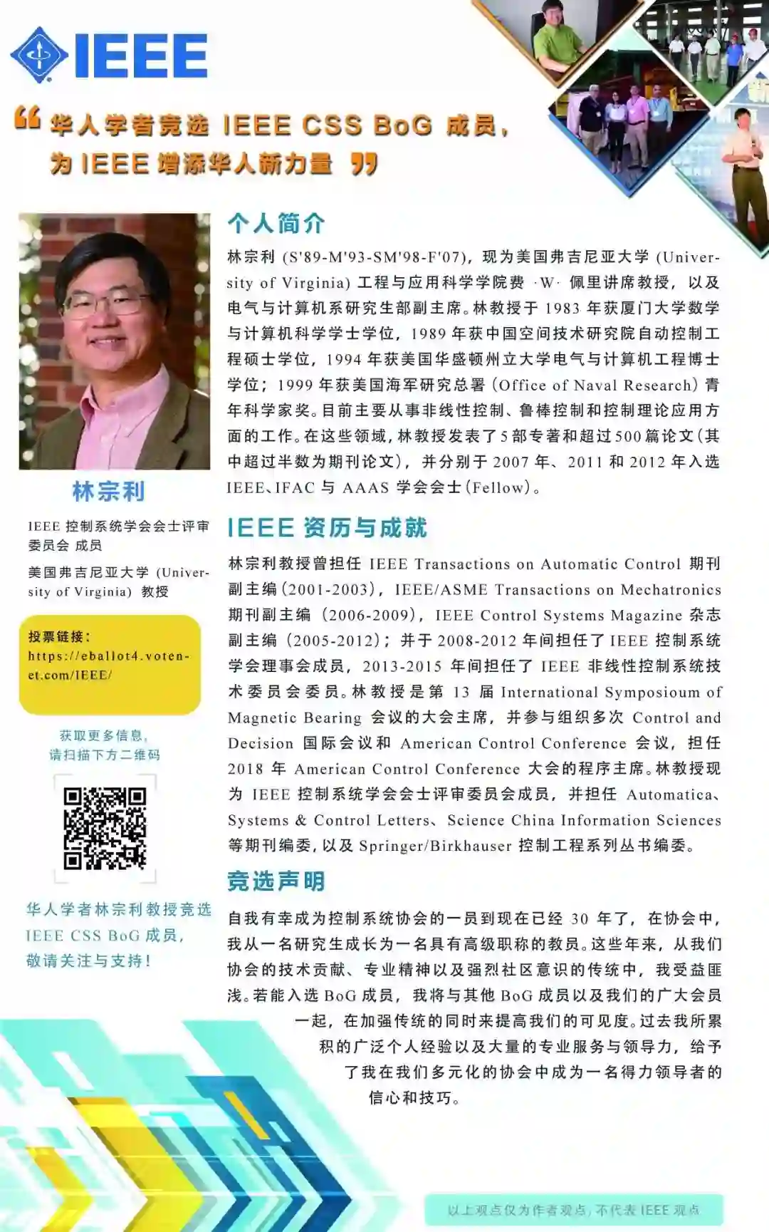 林宗利(S'89-M'93-SM'98-F'07),现为美国弗吉尼亚大学(University of Virginia)工程与应用科学学院费·W·佩里讲席教授,以及电气与计算机系研究生部副主席。林教授于1983年获厦门大学数学与计算机科学学士学位,1989年获中国空间技术研究院自动控制工程硕士学位,1994年获美国华盛顿州立大学电气与计算机工程博士学位;1999年获美国海军研究总署(Office of Naval Research)青年科学家奖。目前主要从事非线性控制、鲁棒控制和控制理论应用方面的工作。在这些领域,林教授发表了5部专著和超过500篇论文(其中超过半数为期刊论文),并分别于2007年、2011和2012年入选IEEE、IFAC与AAAS学会会士(Fellow)。