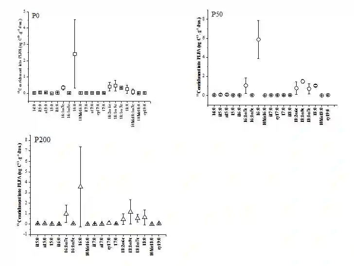 图1. 13C 在细菌磷脂脂肪酸的富集。P0: 100 mg N kg-1, 100 mg K2O kg-1 and 0 mg P2O5 kg-1; P50: 100 mg N kg-1, 100 mg K2O kg-1 和50 mg P2O5 kg-1; P200: 100 mg N kg-1, 100 mg K2O kg-1 和200 mg P2O5 kg-1