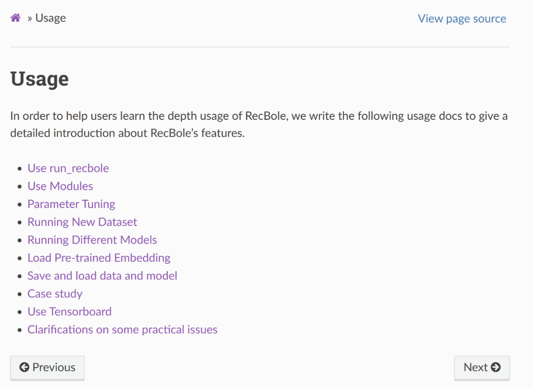 在新版本中,我们对使用文档进行了优化。我们调整了文档结构,并添加了更多的使用示例,方便用户快速上手RecBole。我们添加和更新了“如何加载预训练参数”,“如何保存和加载模型”,“如何使用新数据集”,“如何运行新模型”等使用场景的例子,具体目录如下: